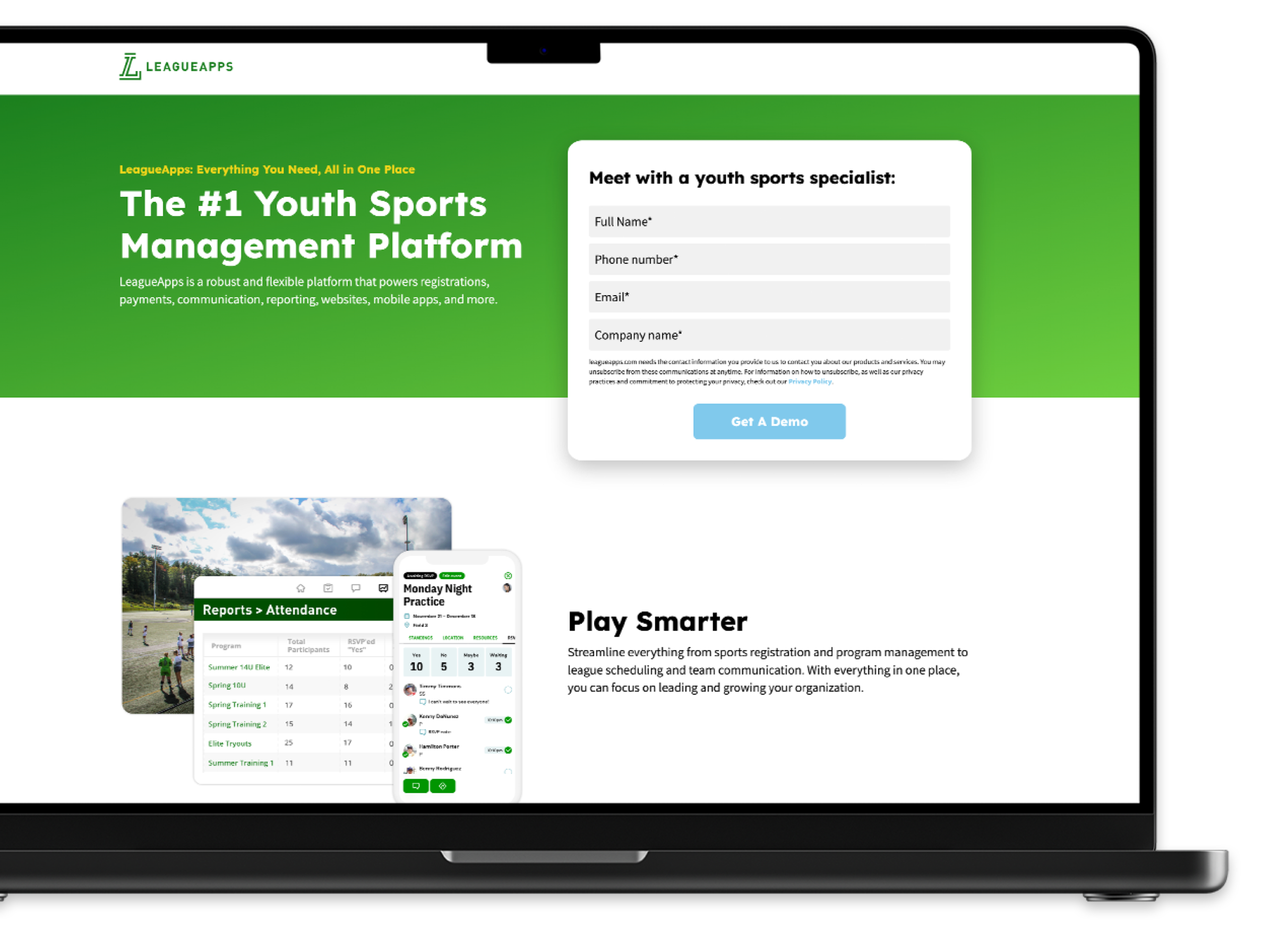 The rest of the page was crafted for impact, featuring concise product highlights, creative service offerings, testimonials, and recognizable logos tailored to resonate with the target audience. The strategic design led to a noticeable increase in inbound leads, directly contributing to higher sales for the LeagueApps.