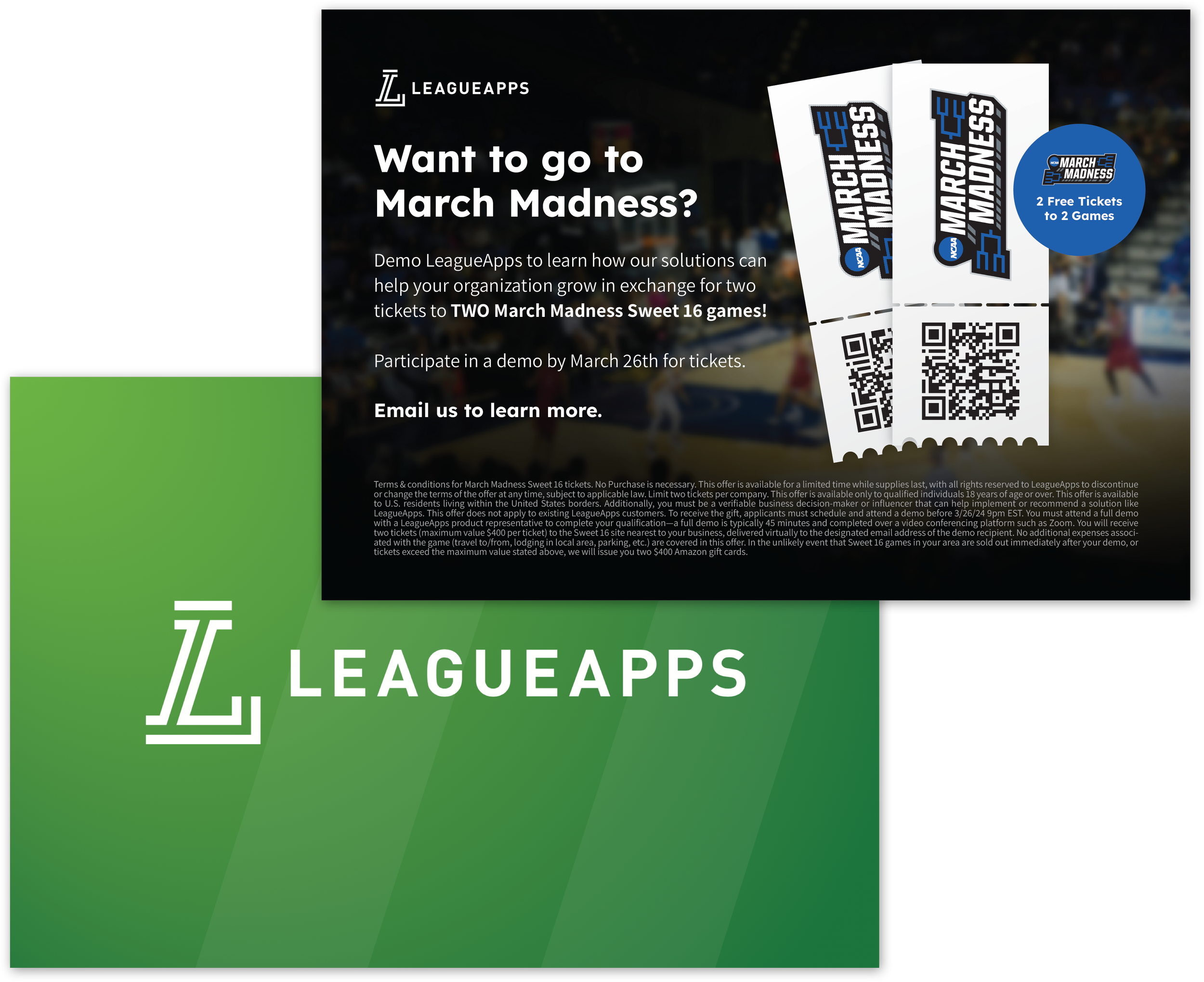 For LeagueApps, I designed a direct mail campaign offering free NCAA basketball tickets to prospective clients who signed up for a product demo. The design prioritized clear information hierarchy, pairing a bold headline and compelling visuals with a prominent call to action. To tie the offer together, I creatively incorporated a QR code into a mock-up of a ticket, making the card intuitive and engaging.